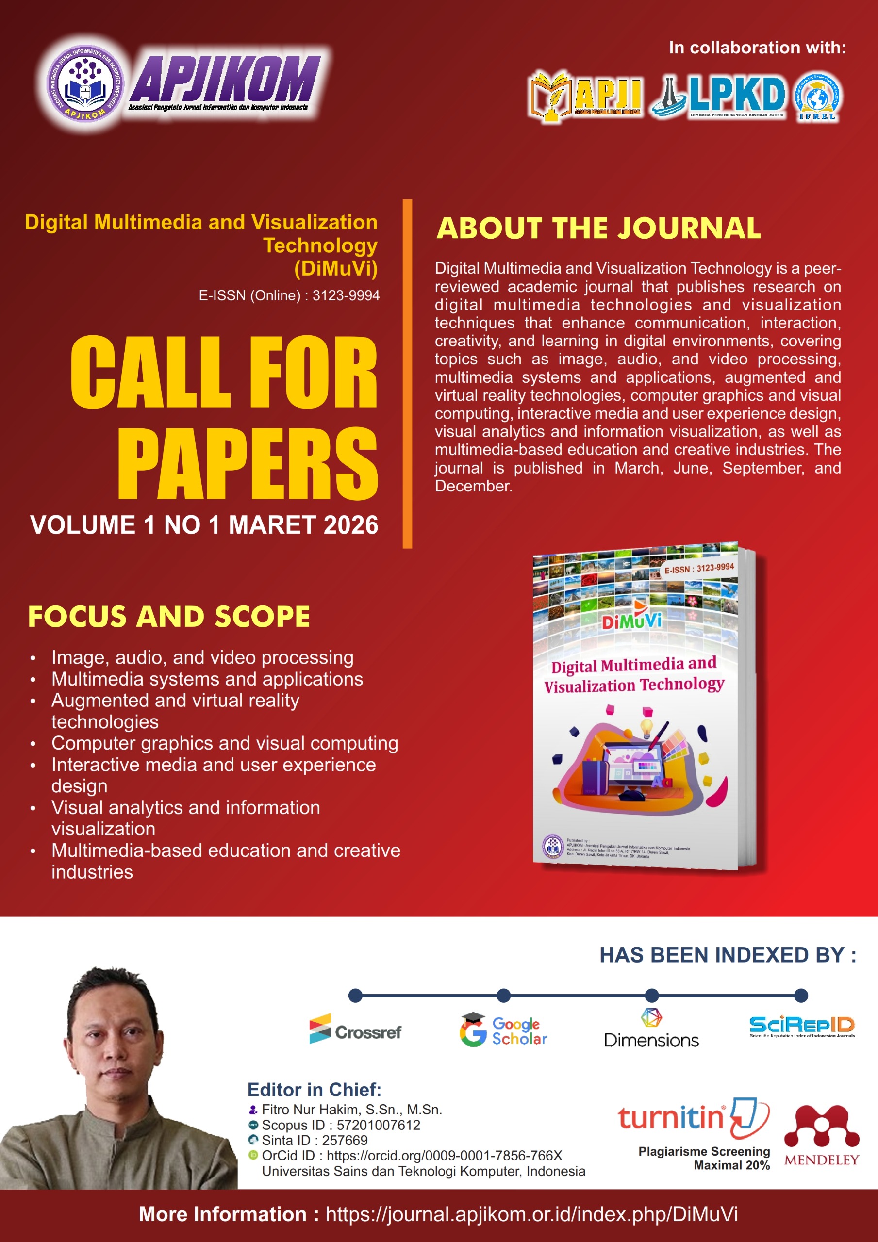 Digital Multimedia and Visualization Technology is a peer-reviewed academic journal that publishes research on digital multimedia technologies and visualization techniques that enhance communication, interaction, creativity, and learning in digital environments, covering topics such as image, audio, and video processing, multimedia systems and applications, augmented and virtual reality technologies, computer graphics and visual computing, interactive media and user experience design, visual analytics and information visualization, as well as multimedia-based education and creative industries. The journal is published in March, June, September, and December.